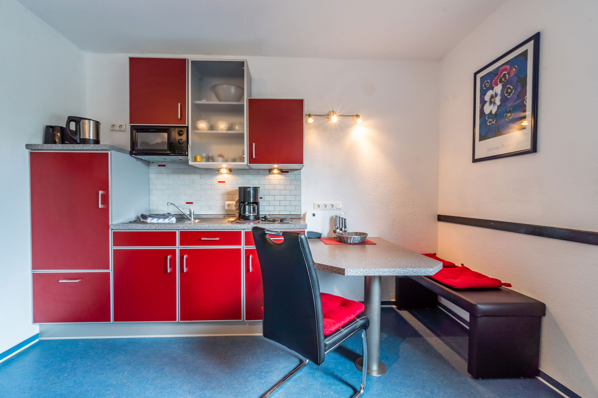 Die Wohnung 2 liegt mit 34 m² im Ergeschoss des Haus Butenbörkumer. Diese Einraumwohnung verfügt über einen Wohnbereich mit Fernsehstühlen und Flat-TV. Direkt anschließend an den Wohnbereich befindet sich die voll ausgestatteter Küchenzeile mit Esstisch, Stuhl und Bank.